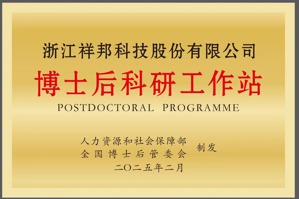 2025年2月經國家人社部、全國博士后管理委員會聯合批準,祥邦科技正式設立國家級博士后科研工作站。這一里程碑距2023年3月建成浙江省博士后工作站僅兩年,標志著公司在產學研融合與核心技術攻堅領域邁入新階段,為深化科研創新體系、打造高端人才高地筑牢了根基。