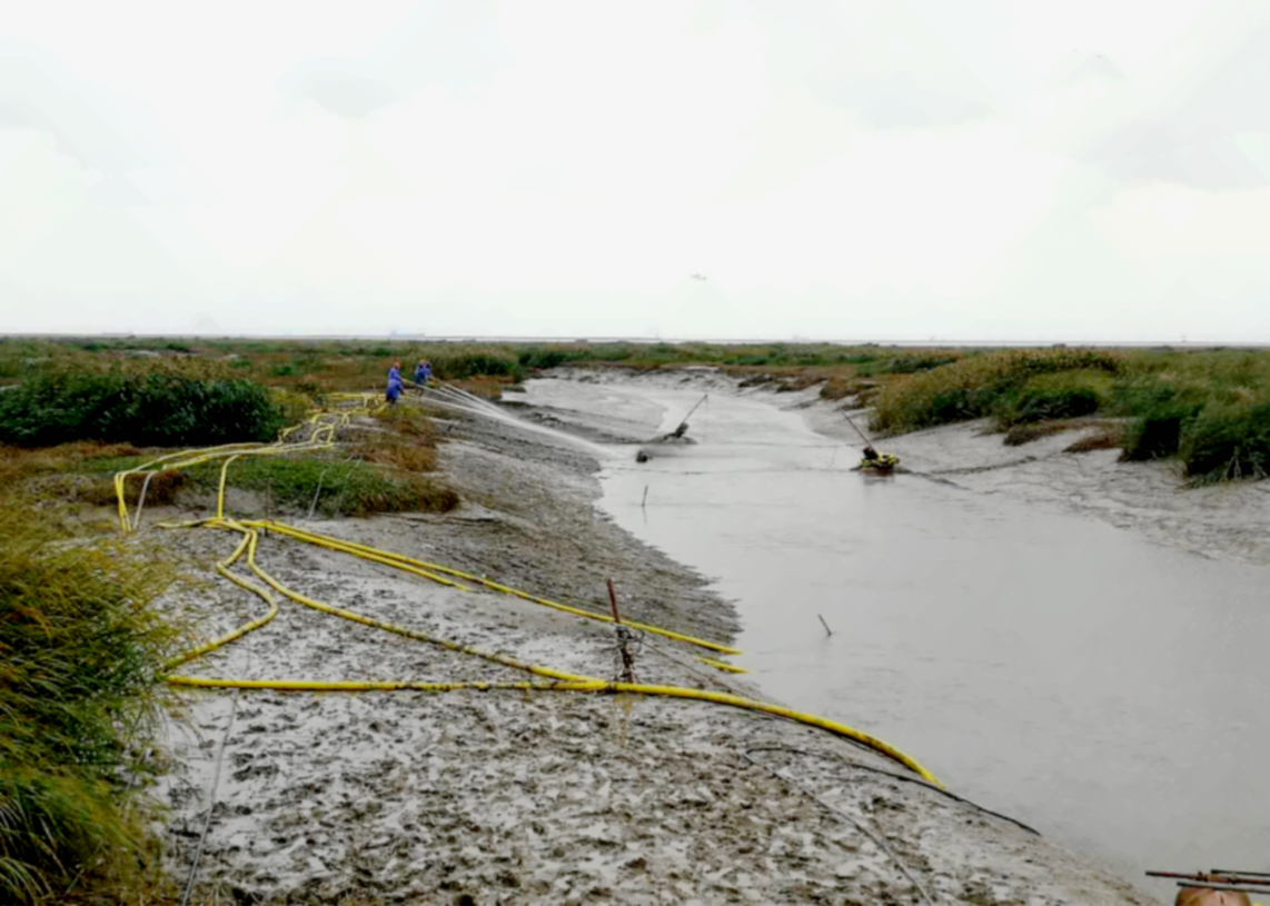 北涵閘外河槽采用水力沖挖機組疏浚,高壓水槍將泥沙沖絞成泥漿,然后用泥漿泵將泥漿抽排出。水力沖挖機組疏浚通過管道將泥漿輸送至棄土區,解決了高灘船舶無法作業的難題和松軟的灘地上陸上機械無法作業的難題。