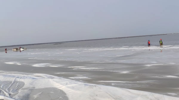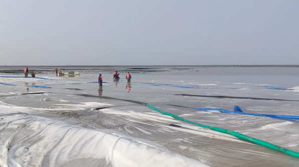 根據(jù)現(xiàn)場水深情況,水下通袋施工采用人工鋪設(shè)與鋪排船鋪設(shè)相結(jié)合的方式施工。人工鋪設(shè)采用沉管施工,在低潮位時人工定位管頭位置,高潮位時將管頭拖至指定位置并沉管。人工鋪設(shè)選在低平潮、水深深度約1m以下時施工,施工定位采用手持GPS四角定位、人工將通長袋拉置指定位置。先將四角打沙沉入水底,在漲潮前移一次管頭從中間開始打砂。鋪排船鋪設(shè)與鋪排方式基本相同。