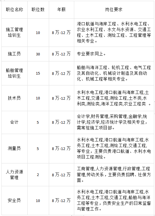 招聘:施工管理培訓生、施工員、船舶管理培訓生、船員、會計、人事專員等人員